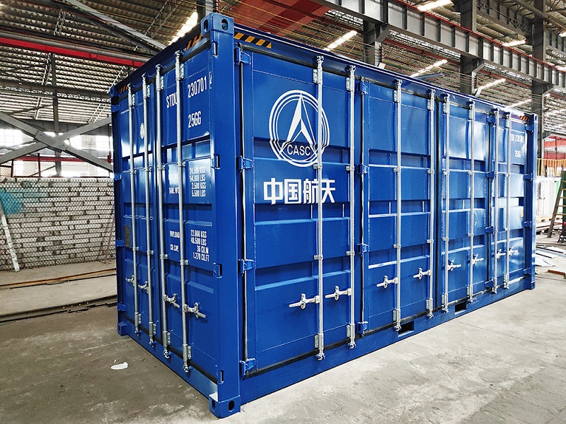 It is reported that this container will be used as the carrier of a special equipment in China Aerospace South China region, and the container will be arranged and built according to the requirements of the relevant aerospace equipment. In terms of appearance, the whole container is sprayed with sky blue color, consistent with the color of the main LOGO of China Aerospace, and the right side of the container is printed with the "China Aerospace (CASC)" LOGO, which is very eye-catching. In terms of dimension, the external dimension of the container is the same as that of the 20 feet high cube shipping container, which is 6058 x 2438 x 2896 mm (LxWxH), which is convenient for the overall lifting and transfer in the later stage. In terms of structure, the right side of the container is fully open, while retaining the container standard rear door, the whole container adopts the production standard of shipping containers, sealing and waterproof requirements are up to CSC standards, and the maximum payload capacity can reach 22 tons.