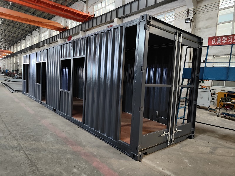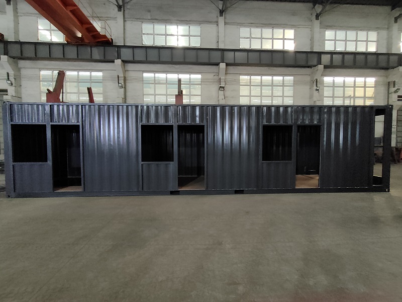 In terms of materials, the bottom beam is replaced by 16# hot-rolled channel steel, which greatly enhances the toughness of the base structure, and other materials such as the top, side wall panels, corner fittings, corner post, etc. are the same as the standard shipping container materials. In addition, in order to facilitate subsequent internal decoration, the left, right and front walls of the container are provided with a ring of 50 x 28 mm vertical ribs and 50 x 2 mm flat iron.