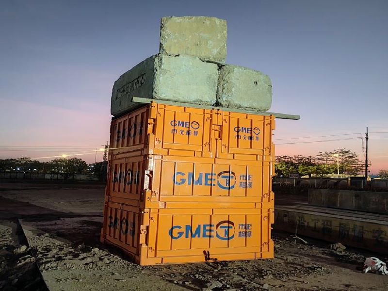 It is understood that the test container is divided into two sizes, the first external size is 2000 x 1000 x 1000 mm (LxWxH), the second external size is 2000 x 2000 x 1000 mm (LxWxH). In terms of structure, the floor of both boxes is made of 5 mm flat steel plate, the bottom beam of 80x30x30x3 mm bending parts is laid, and the bottom side beam of 12.6# I-beam is matched, and the corner column is 75x75x10 mm square pipe. The side panels are collapsible and connected to the floor with 30 mm diameter high-strength wear-resistant pins. The stacking capacity of a single container is 26 tons, and the number of self-stacking layers is 6 layers.